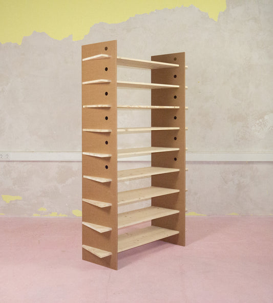 Zu allen 9er SetsDie 9er Regalsysteme sind mit ihrer Höhe von 125cm ein perfekter Begleiter für dein Zuhause. Der Name leitet sich aus den 9 Öffnungen der Stützen ab, die dir unzählige Möglichkeiten geben, dein Pappe.Fichte.Fertig. Möbel zu konfigurieren.